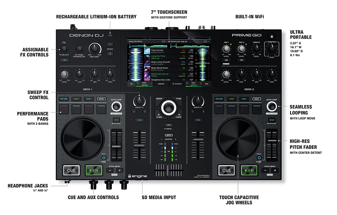Small in size but BIG in connectivity and DJ workflow features. PRIME GO has independent dual mic control, pro-grade I/O and 24-bit/48k audio quality. All critical pro-DJ features are at hand, including dual-FX engines, 2-deck mixing, auxiliary input plus bank switching performance pads.