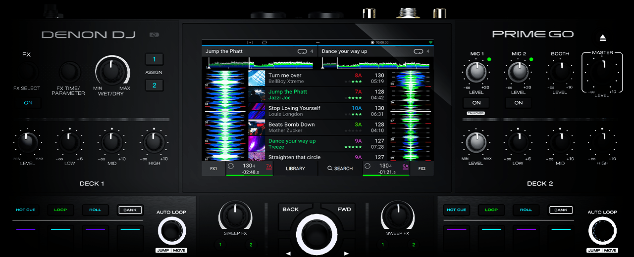 PRIME GO's, 7" HD Touchscreen gives DJs tactile control of digital media library navigation, waveform views plus track search and load. It offers familiar 'touch/swipe' control over WiFi streaming of premier music services and enables direct, onboard recording to connected USB/SD media.