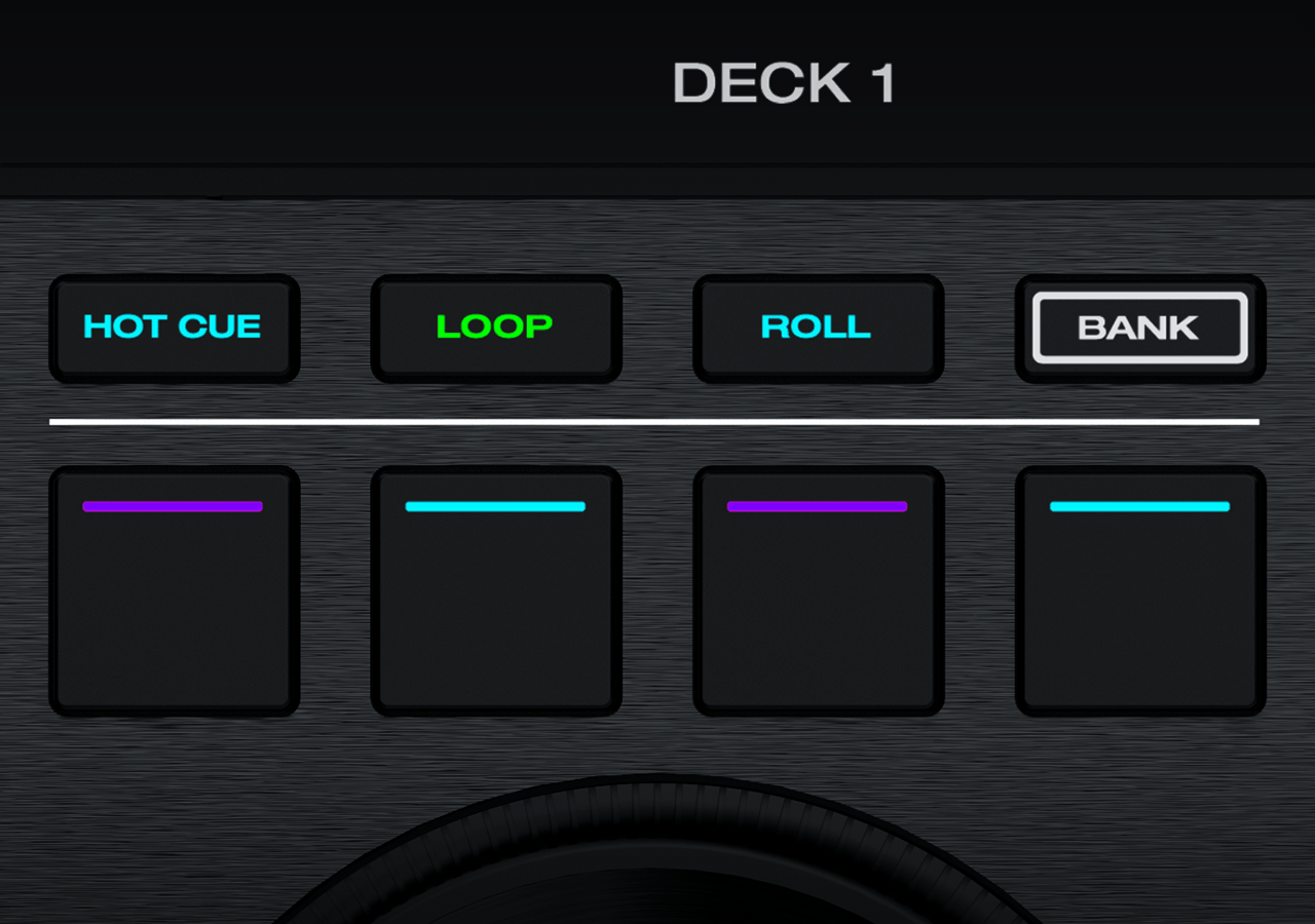 Dual-bank (2x4) ultra-responsive trigger pads for hotcue juggling, looping and beat rolls