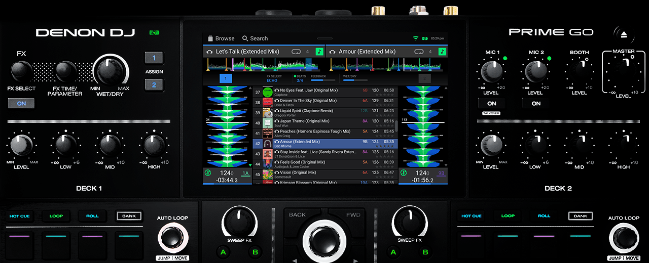 Small in size but BIG in connectivity and DJ workflow features. PRIME GO has independent dual mic control, pro-grade I/O and 24-bit/44.1kHz audio quality. All critical pro-DJ features are at hand, including dual-FX engines, 2-deck mixing, auxiliary input plus bank switching performance pads.
