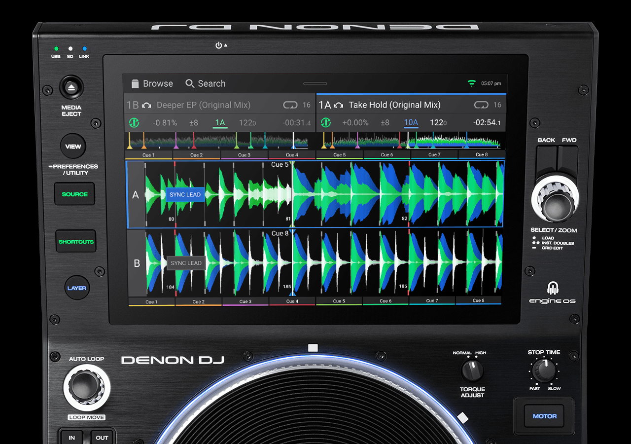 With dual output 24-bit, 96kHz digital audio quality, the SC6000 supports all major compressed and uncompressed music file formats – including AIFF, FLAC, ALAC, and WAV. With built-in WiFi and wired internet connectivity, DJs can now stream music, standalone, from Beatport LINK, Beatsource LINK, SoundCloud GO+, TIDAL, and even personal cloud music stored to Dropbox.
