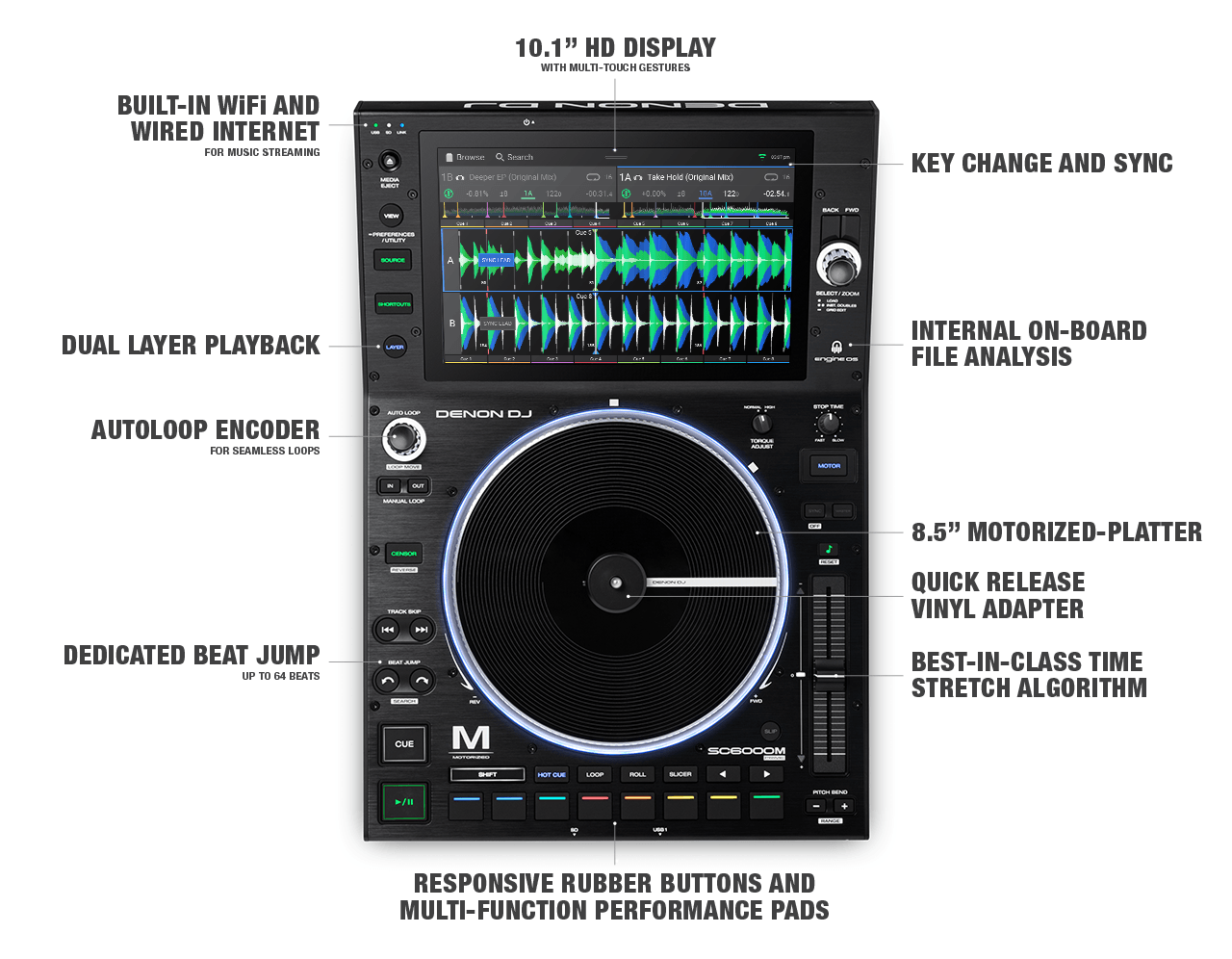 The SC6000M's onboard musical keyshift, key-match feature enables beautifully harmonic DJ sets to be effortlessly performed. Create sonic textures with just the touch of a finger
